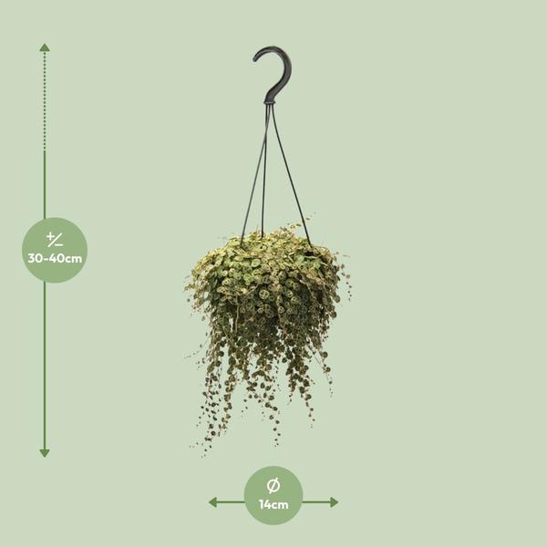 Ontmoet de Peperomia Prostrata, een niet-giftige hangplant die charmeert met zijn levendige, ronde groene bladeren en unieke patronen. Perfect voor halfschaduwplekken, voegt hij elegantie toe aan elke kamer zonder veel onderhoud te vragen. Met een potmaat van 14 cm en een hoogte van 38 cm is hij ideaal voor kleine ruimtes. Geniet van zijn natuurlijke schoonheid en creëer een serene, groene oase in huis. Bestel nu bij Mr. Leaf en laat je interieur stralen!
